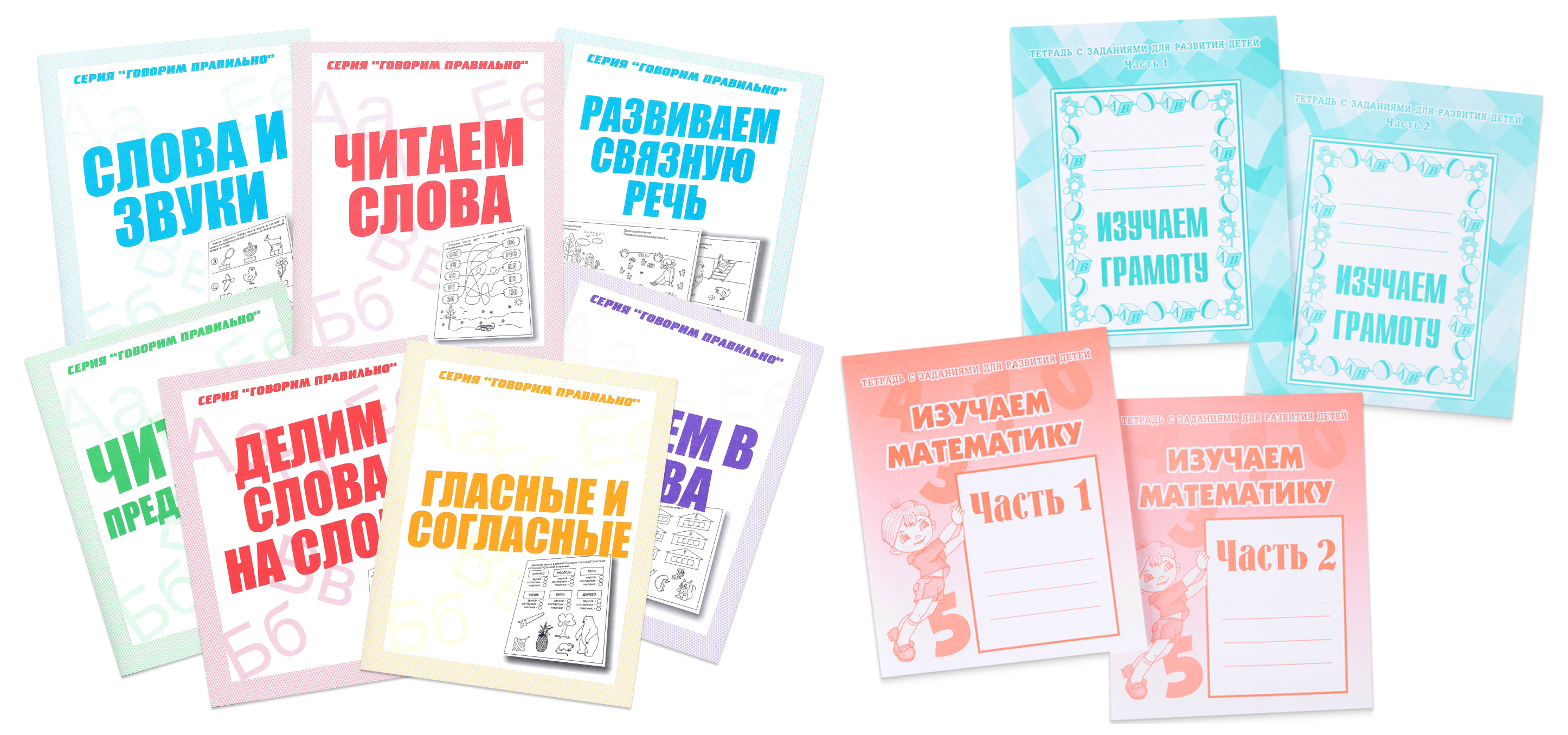1. «Говорим правильно» — набор из 7 тетрадей (по 32 страницы) для дошкольников и младших школьников. В игровой форме ребёнок научится читать, изучит буквы и звуки, сделает речь более грамотной и связной. Тетради доступны как в наборе, так и по отдельности.