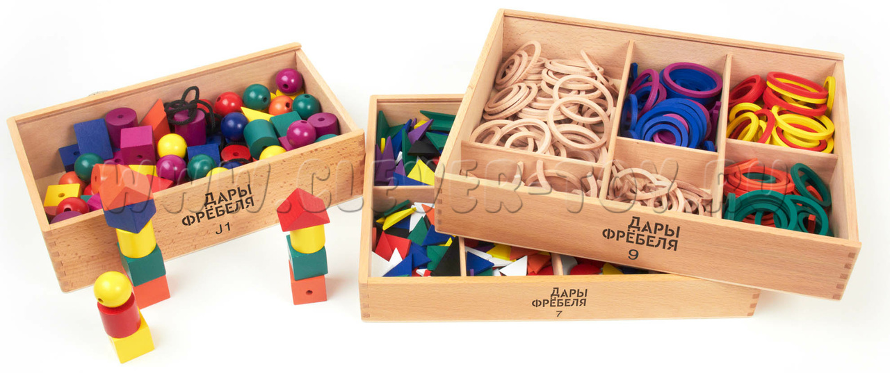 Игровой набор "Дары Фребеля" изготовлен из качественных натуральных материалов (дерева и хлопка). В комплекте 14 модулей и 6 методических пособий соответствующих ФГОС ДО.