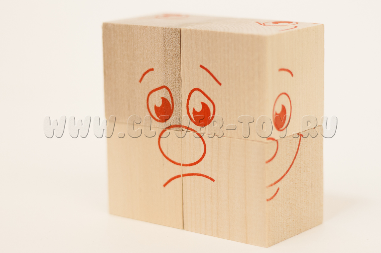 В состав входит четыре кубика, из которых ребенок может собрать 6 изображений, передающих настроение.
