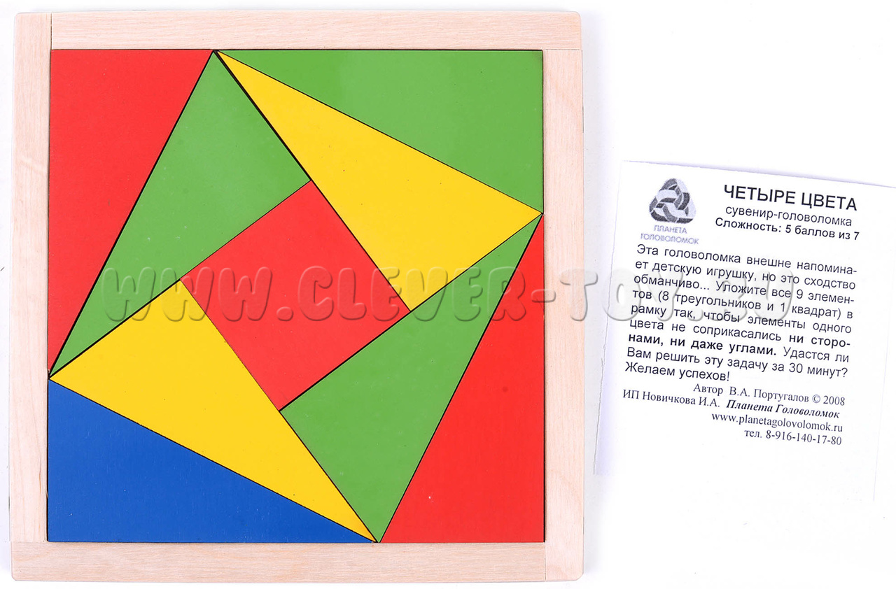 Задача головоломки уложить 9 элементов в рамку так, что б элементы одного цвета не соприкасались ни сторонами, ни даже углами. Может показаться, что это просто. Однако это сложнее чем кажется. Сложность головоломки 5 баллов из 7.