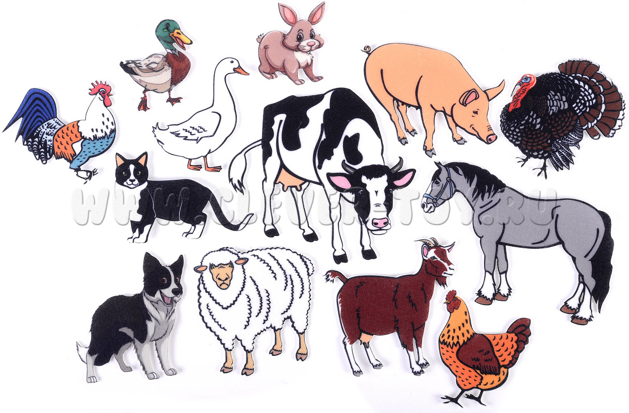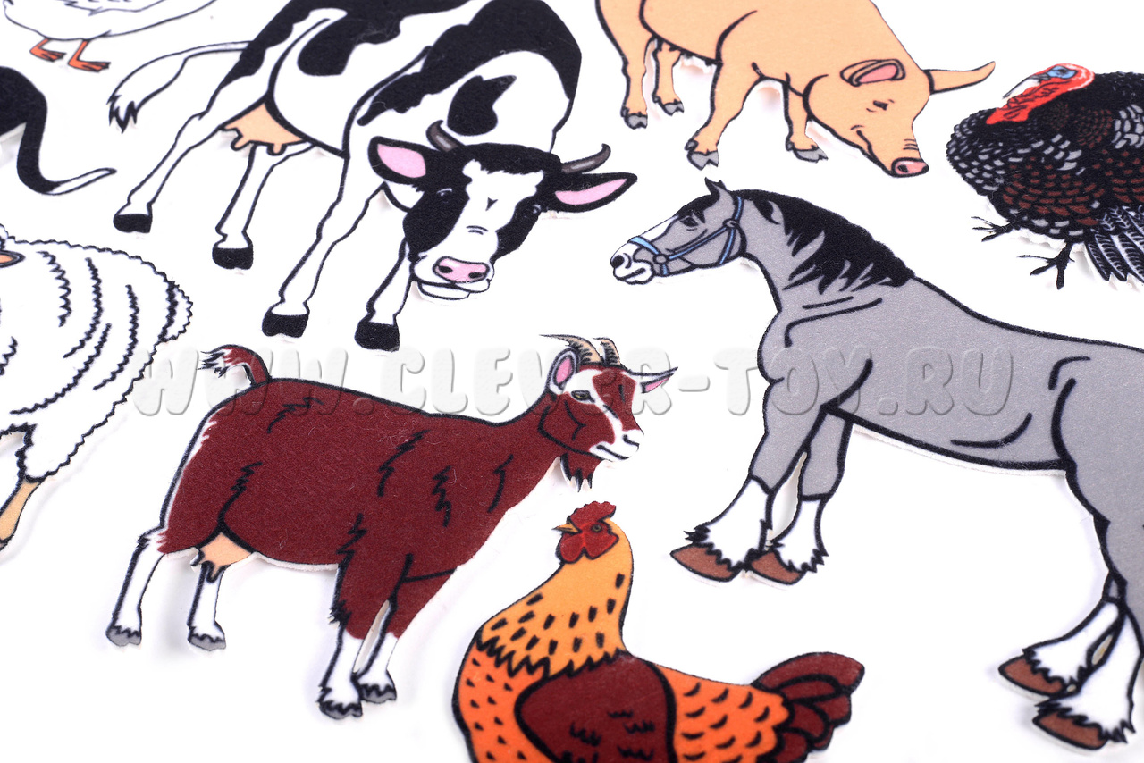 - 13 игровых элементов с изображением лошади, индюка, коровы, кролика, кота, собаки, овцы, свиньи, утки, курицы, петуха, гуся, козы.