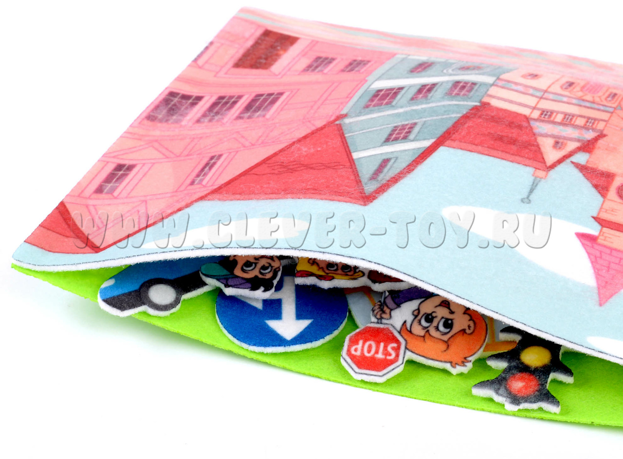 • игровое поле с изображением города и дороги в форме конверта, в котором удобно хранить игровые элементы.