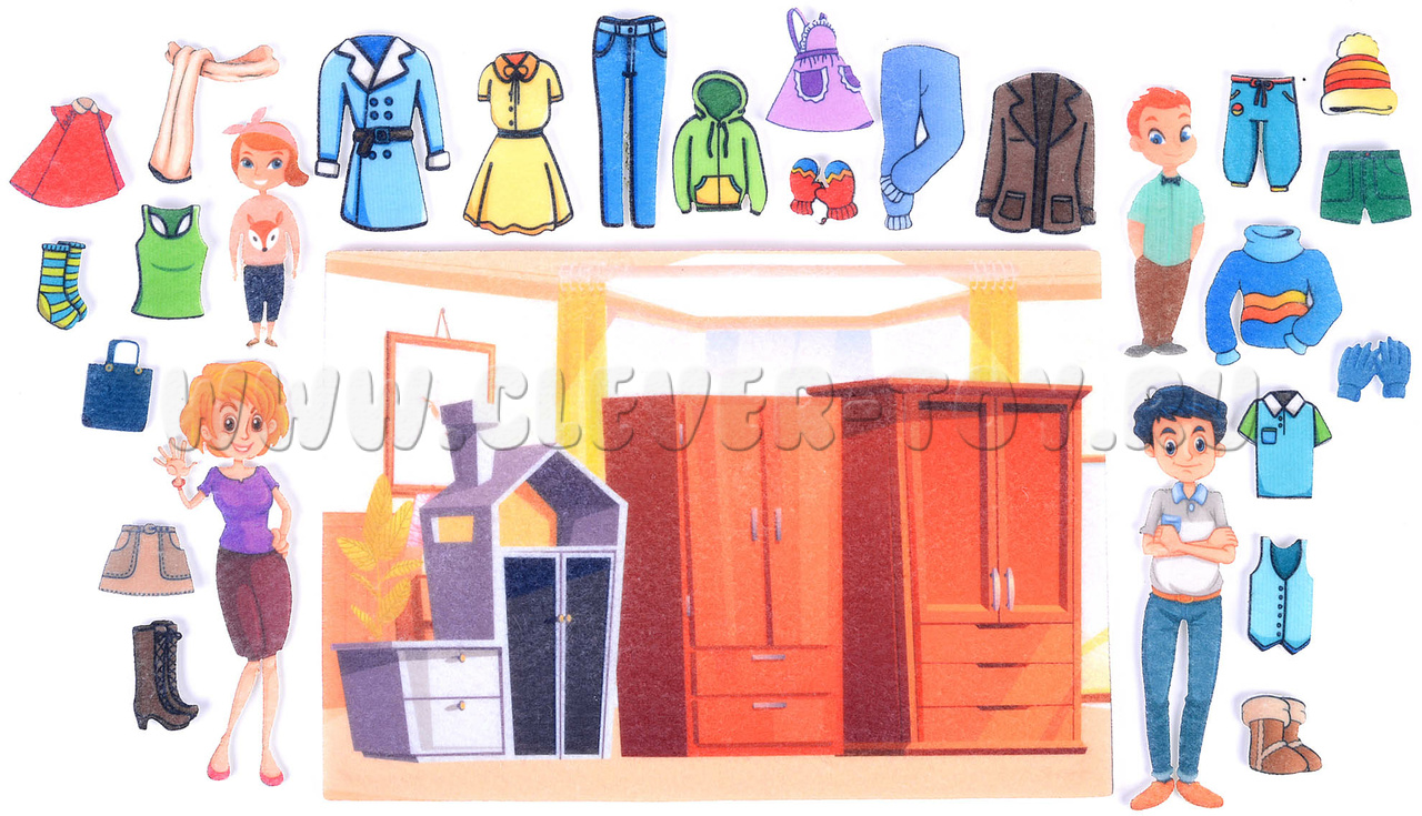 В чем папа пойдет на работу? Как не испачкаться на кухне? В какое время года надеть шапку и варежки? На этот и другие вопросы малыш отыщет ответы, наряжая веселую семью в пальто и платьица. Можно даже придумать историю о приключениях домочадцев и разыграть ее по ролям.