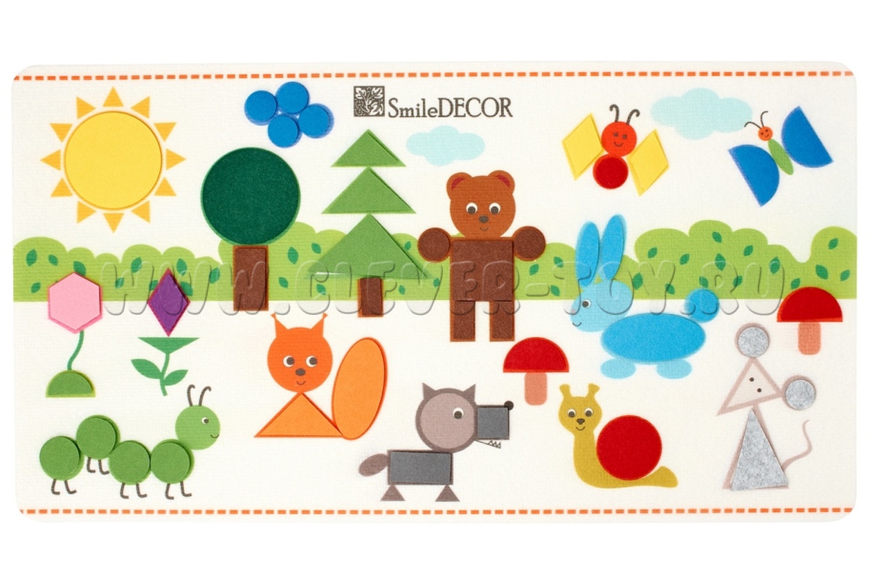 В наборе ковер из фетра (48*84 см), 42 геометрические фигуры на липучках, 2 листа карточек для вырезания, 2 планшета из 9 клеток.