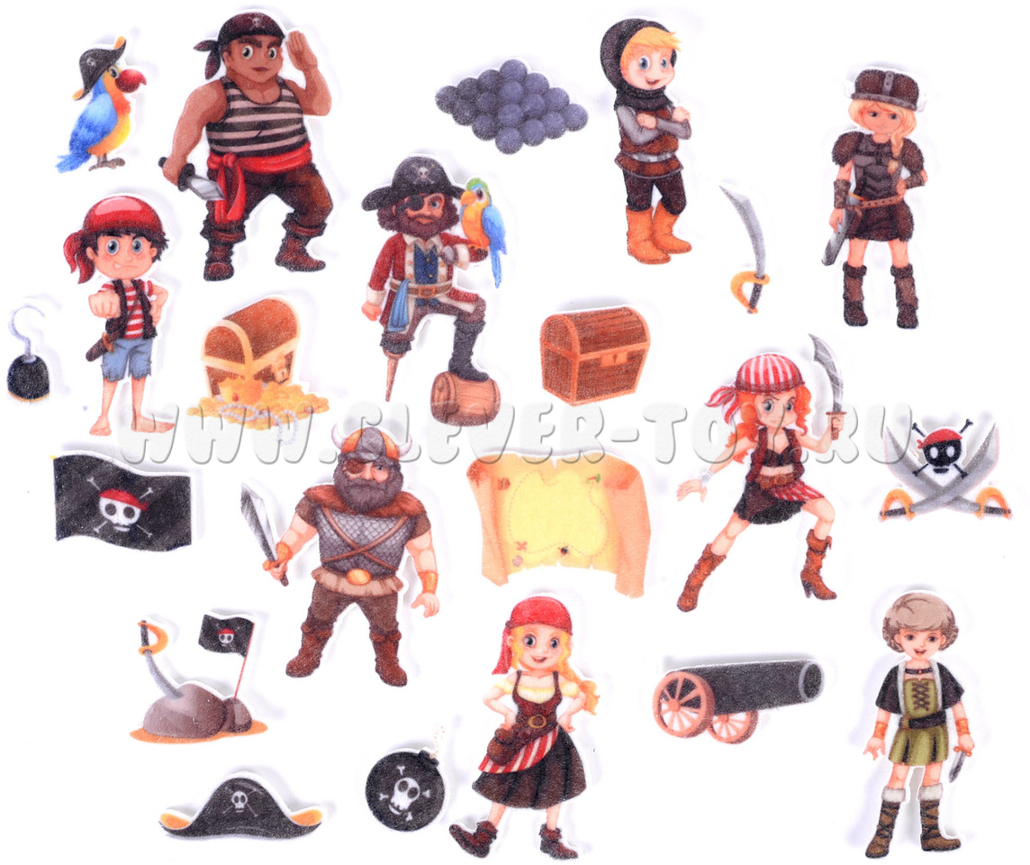 • атрибуты: карта, чёрный флаг, ядра, шляпа, место, где спрятан клад, сундук с сокровищами, пушка и т.д.,