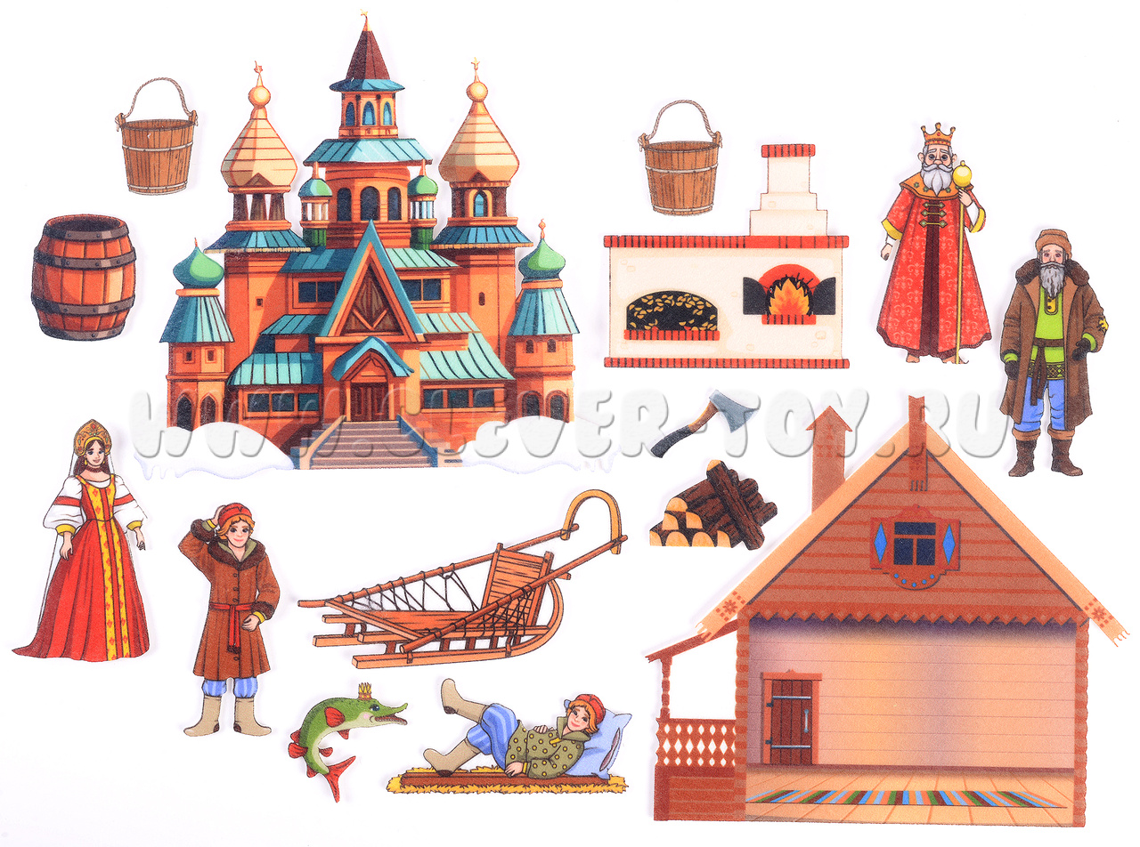 «По щучьему велению» — это игра, которая знакомит детей с русской народной сказкой, развивает их воображение и фантазию. С помощью игры ребёнок также улучшает свою речь.В состав набора входят игровое поле и 18 фигурок.