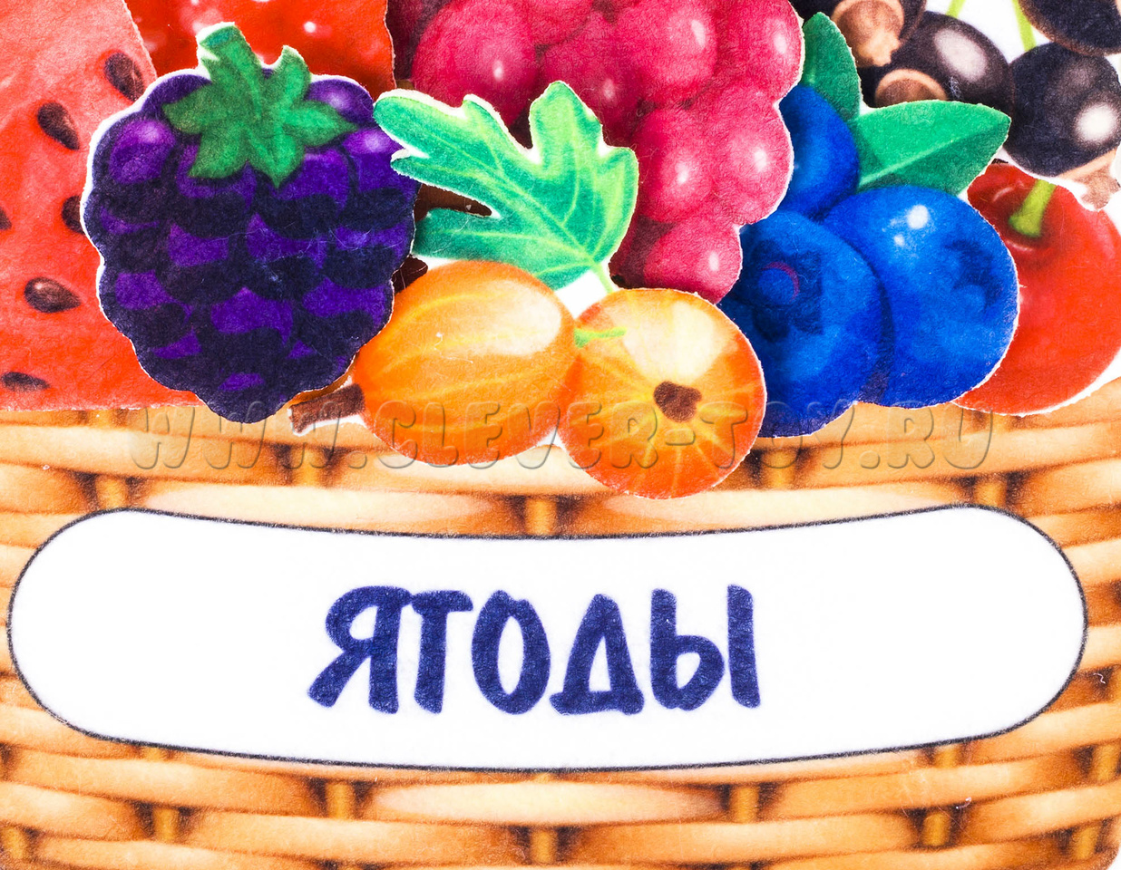 • ягоды из фетра разных видов – клубника, крыжовник, малина, арбуз, вишня, ежевика, голубика, красная смородина, черноплодная смородина, виноград.