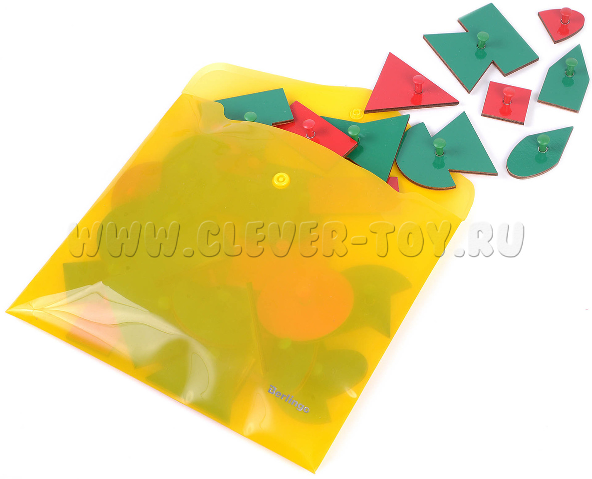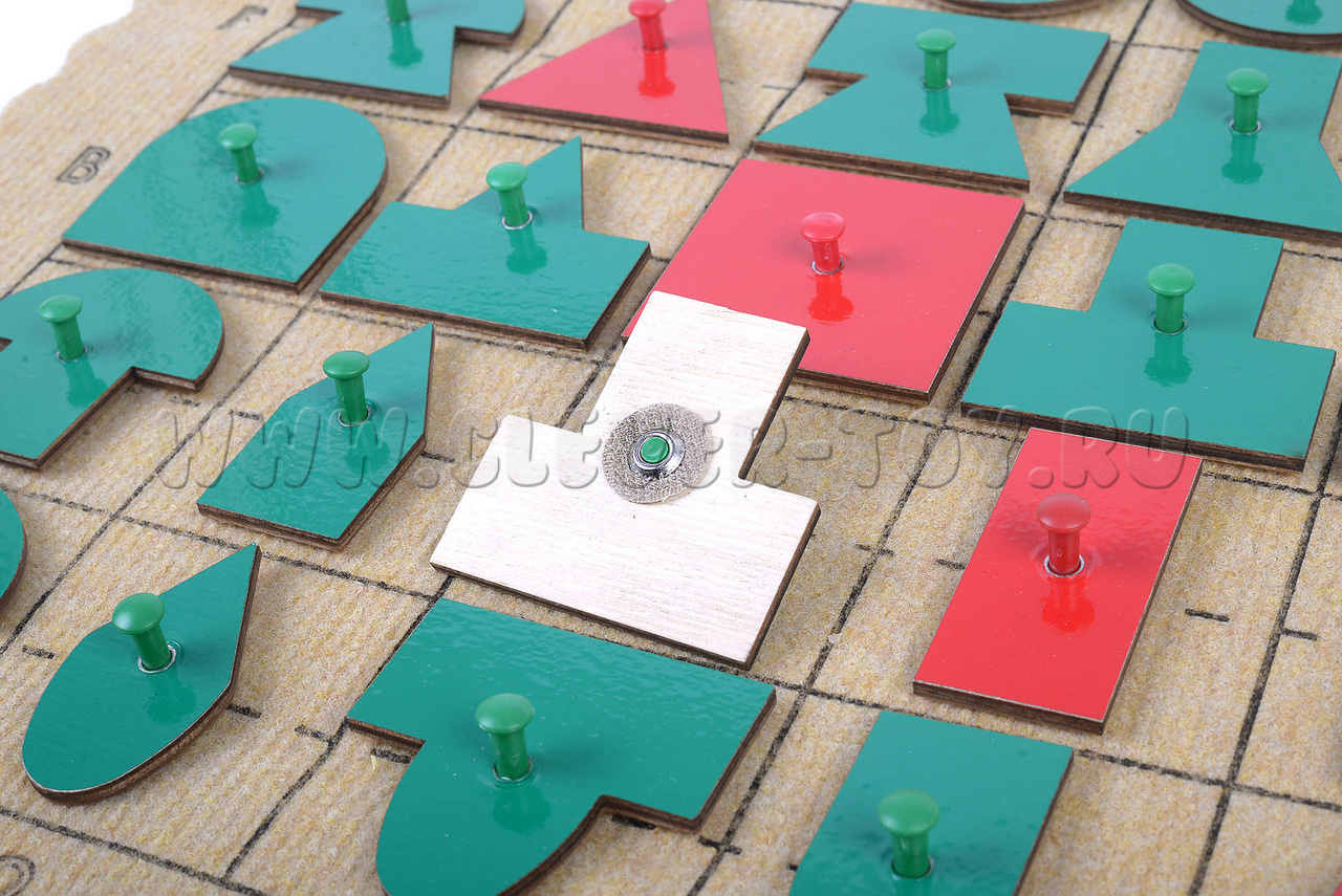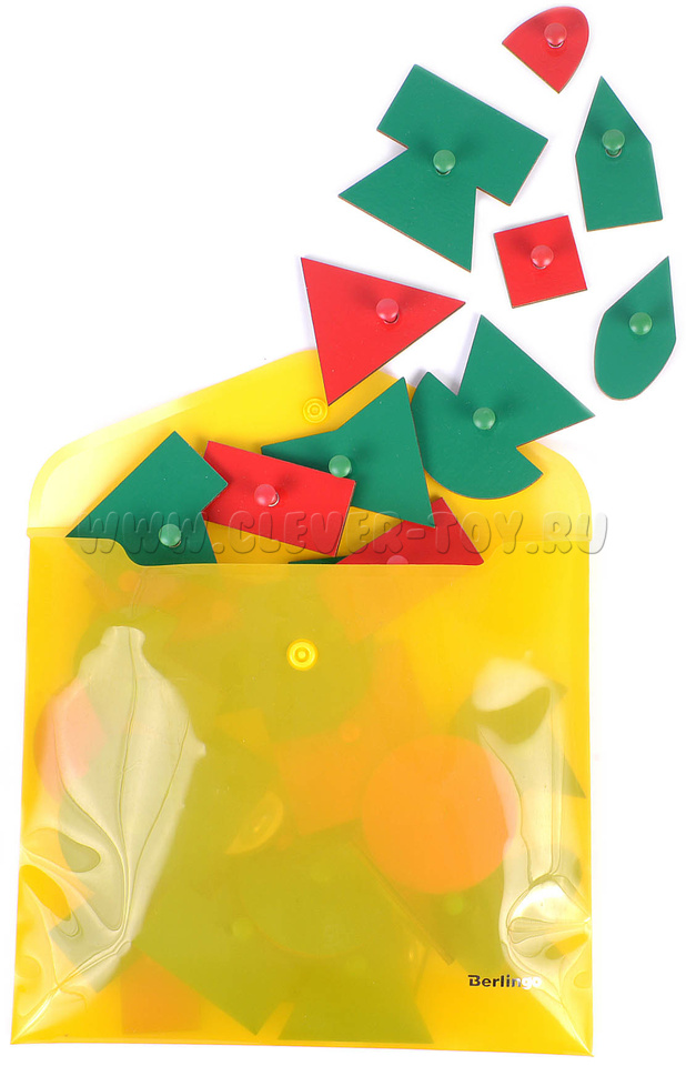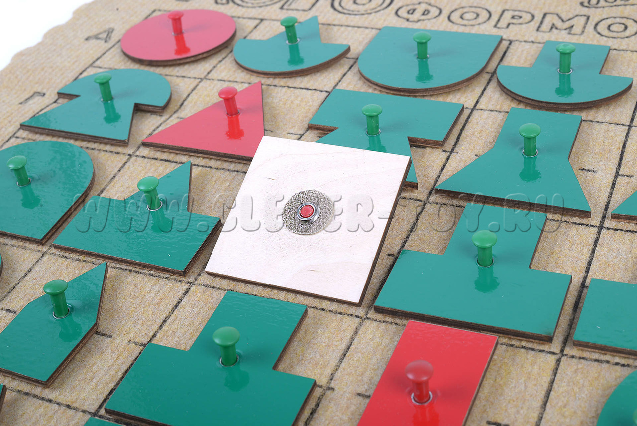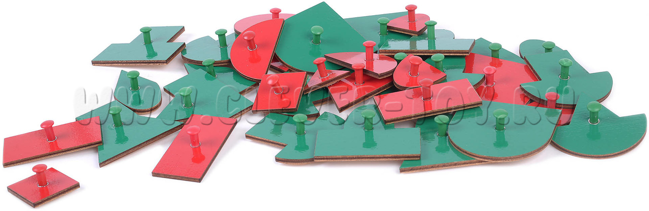 • эталонные фигуры с держателями – красного цвета – 5 шт., составные фигуры зелёного цвета – 20 шт., половинки эталонных фигур красного цвета – 10 шт.;