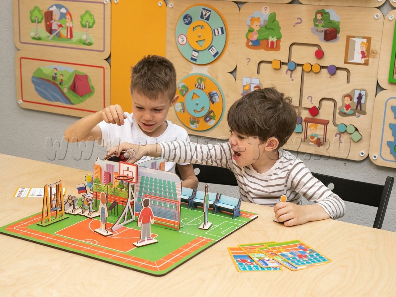 - Путешествие. Локация предлагает площадки для разыгрывания сюжетов семейного досуга в формате путешествий по России (поездка в горы, на пляж/водоем, в лес, на дачу).