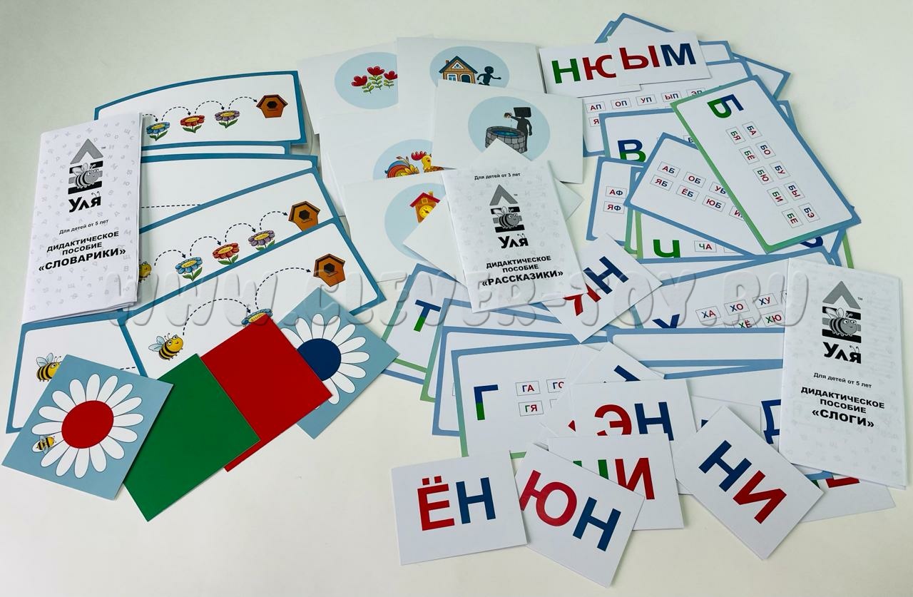 • сценарии занятий «Улин букварик», направленные на развитие речи и навыков звуко-буквенного анализа и формирование представлений о «звуке», «букве», «слоге», «слове». Содержат 35 двухсторонних карточек формата А4.