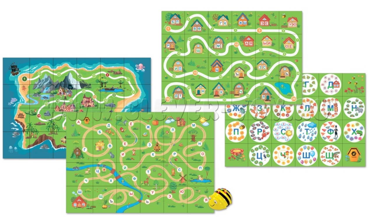 - Игровые двусторонние тематические поля «Городок букв»/«Сказка» и «Слоги»/«Путешествие» для занятий с мини-роботами Bee-Bot и игр в «ходилки»