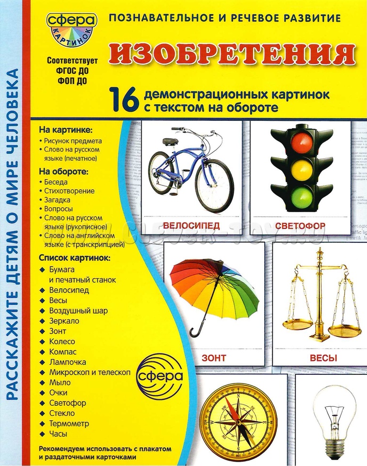 Комплект картинок "Изобретения" состоит из 16 цветных демонстрационных карточек (картинок) и адресован детям и их родителям, желающим познакомиться с самыми важными, а порой и необычными изобретениями, которые в наше время стали жизненно важными и необходимыми в повседневной деятельности.