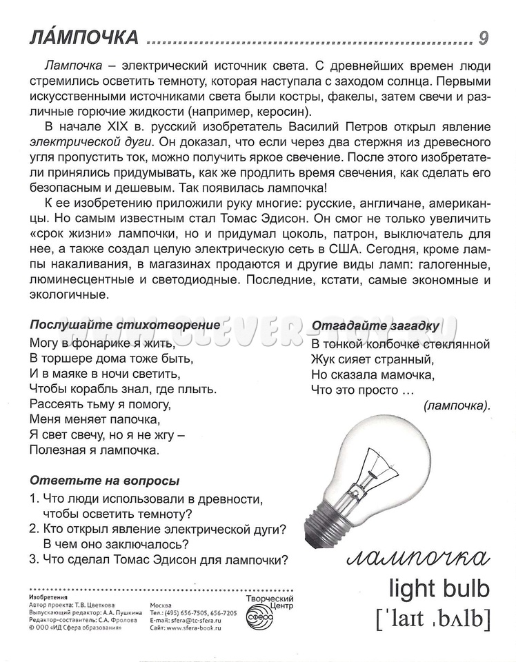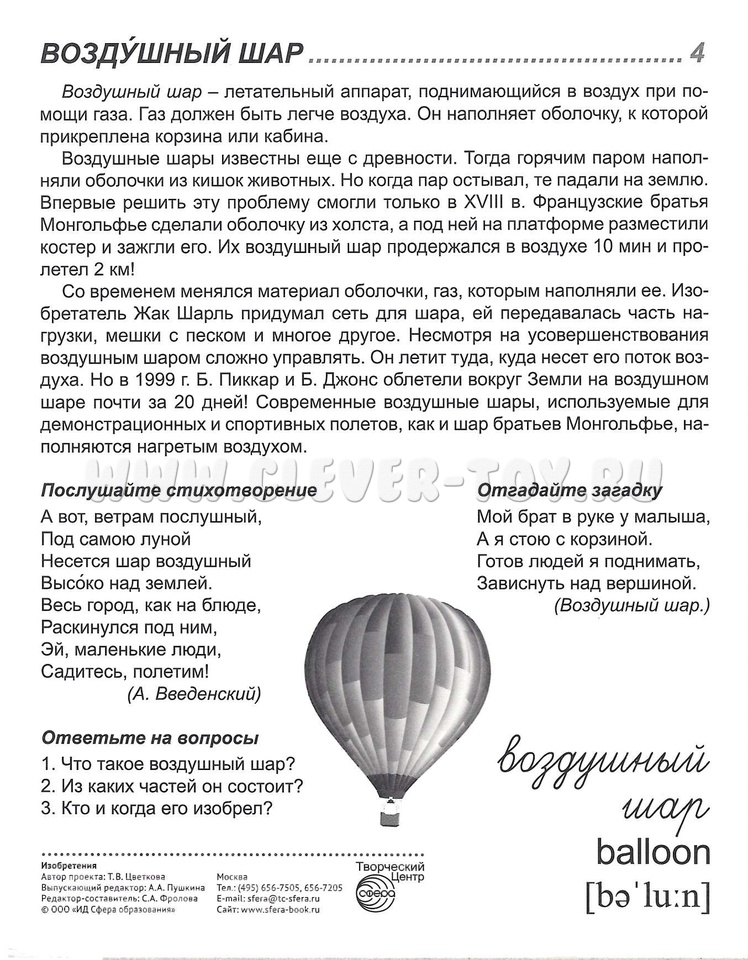На лицевой стороне каждой карточки дается цветное изображение какого-либо изобретения, на обратной - подробное описание, из которого дети узнают много интересного и поучительного. Для лучшего закрепления материала представлены оригинальные стихотворения и рифмованные загадки по теме, а также вопросы, на которые ребенок ответит после изучения материала или беседы со взрослым. Название каждой статьи имеет перевод на английский язык и транскрипцию.