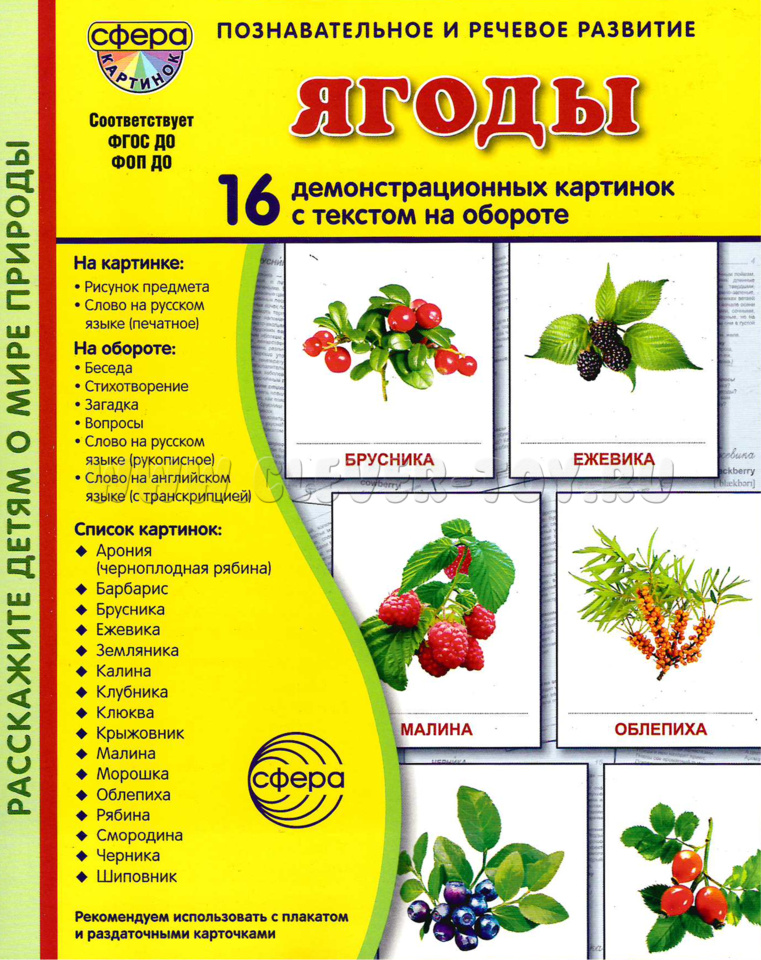 Комплект "Ягоды" состоит из 16 цветных демонстрационных карточек (картинок) и адресован детям и их родителям, желающим познакомиться с полезными ягодами, растущими на территории нашей страны.