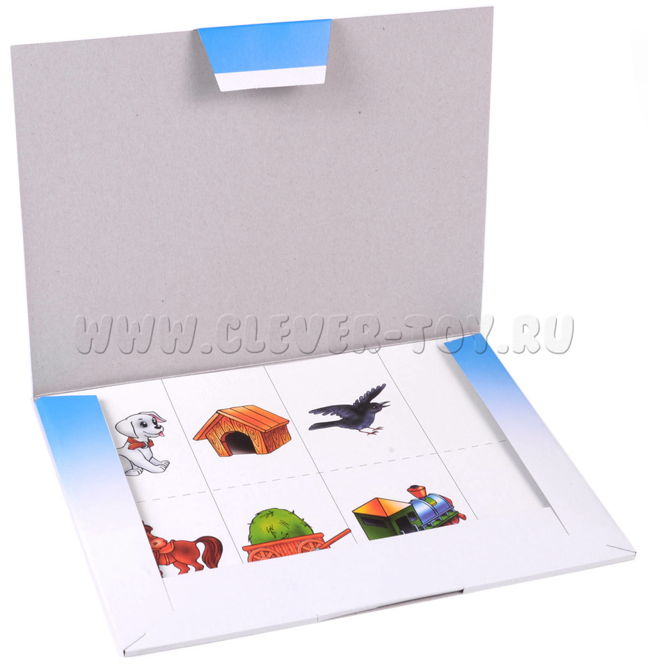 В наборе папка для хранения и 10 карт: 16 неоконченных смысловых цепочек и 16 картинок-окончаний. Перед началом игры разрежьте карты по пунктирным линиям. Предложите малышу найти закономерность и подобрать подходящую к цепочке картинку, выложив ее на пустую клетку карты. Попросите ребенка аргументировать свой выбор.