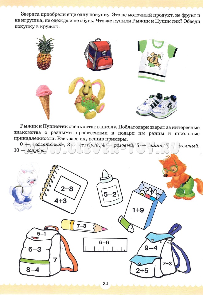 Вместе со сказочными персонажами Рыжиком и Пушистиком малыши, познакомятся с людьми разных профессий, закрепят знания цифр, вспомнят их последовательность в числовом ряду, познакомятся с составом чисел из двух меньших, узнают про сложение и вычитание, про математические знаки, научатся решать простые задачки, писать цифры.