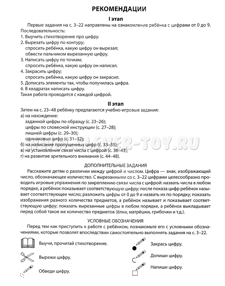 Перед тем как приступить к работе с ребёнком, познакомьте его с условными обозначениями (страница 2), которые позволят впоследствии самостоятельно выполнять задания.