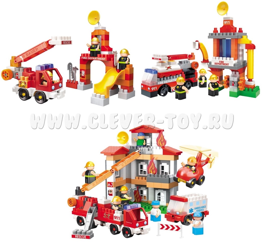 Набор развивающего конструктора BAUER, посвященный работе спасателей – серия «ПОЖАРНЫЕ». Детали конструктора позволяют собрать различные машины служб спасения, а также всевозможные атрибуты пожарной станции -например, гидрант, тренировочную площадку, пожарную вышку и т.д. Входящие в набор наклейки позволяют добавить индивидуальности каждому зданию, автомобилю и персонажу. Конструктор созданн из безопасного пластика с использованием пищевых красителей.