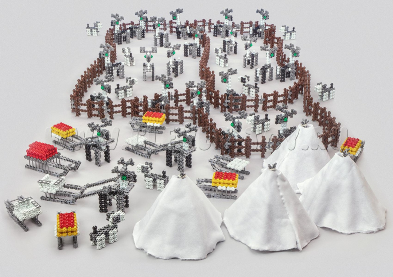 Комплект "Стойбище" (для детей 5–7 лет) предназначен для творческого конструирования чумов, оленей, собак, 4 видов нарт и кораля.