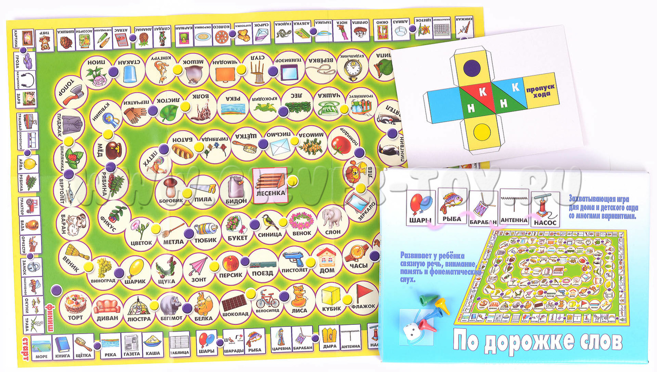 "По дорожке слов" – развивающая настольная игра-ходилка для детей старше 3-х лет, которая поможет малышам развить связную речь, фонематический слух, внимание, память и воображение.