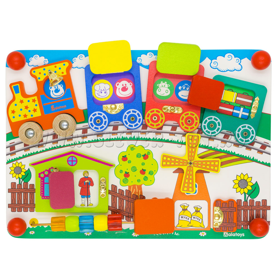 Бизиборд «Вагончики» от крупнейшего производителя деревянных игрушек – фабрики «Алатойс» - выполнен из экологически чистого материала – дерева (берёза).