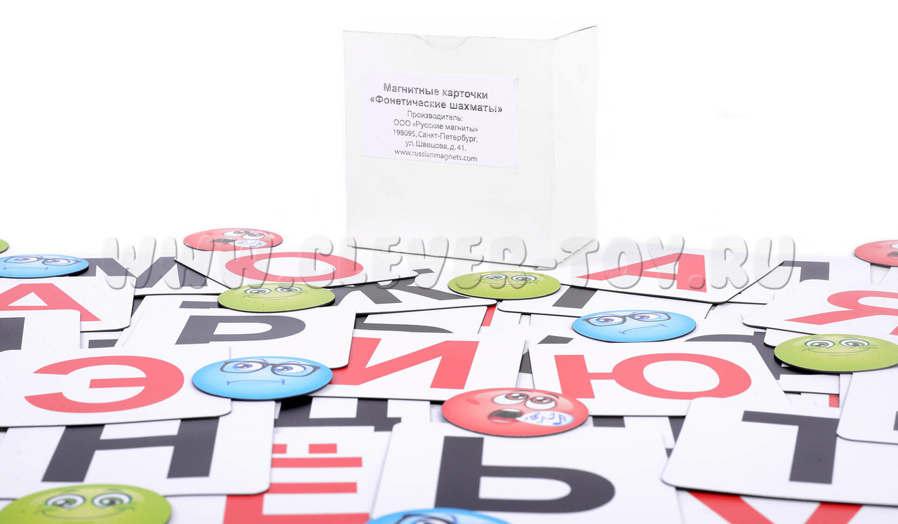 В комплекте 71 магнитные карточки с буквами, 1 пустая карточка, 30 магнитных смайлов.